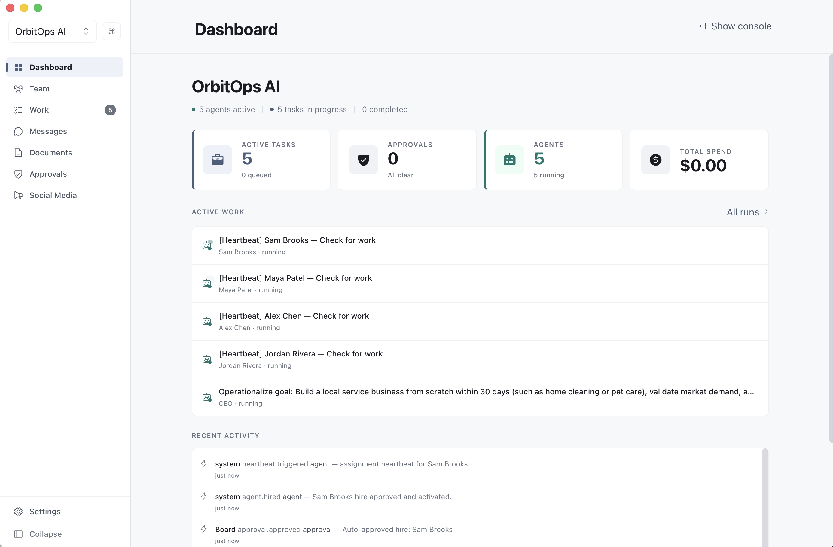When you create a company with a goal, the AI CEO agent analyzes the objective, creates the necessary departments (Engineering, Design, Marketing, etc.), hires specialized agents for each role, builds an org chart, and delegates tasks. The CEO monitors progress, handles blockers, and coordinates cross-department work — all autonomously.